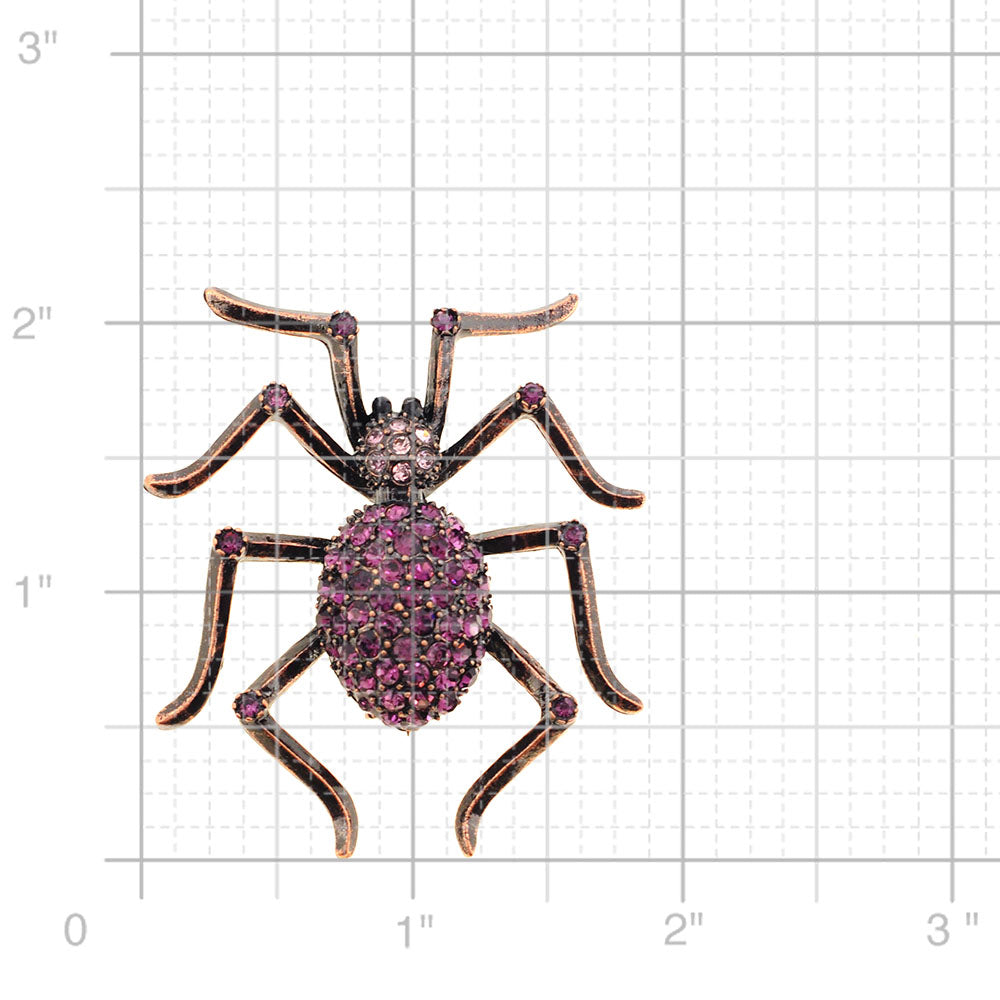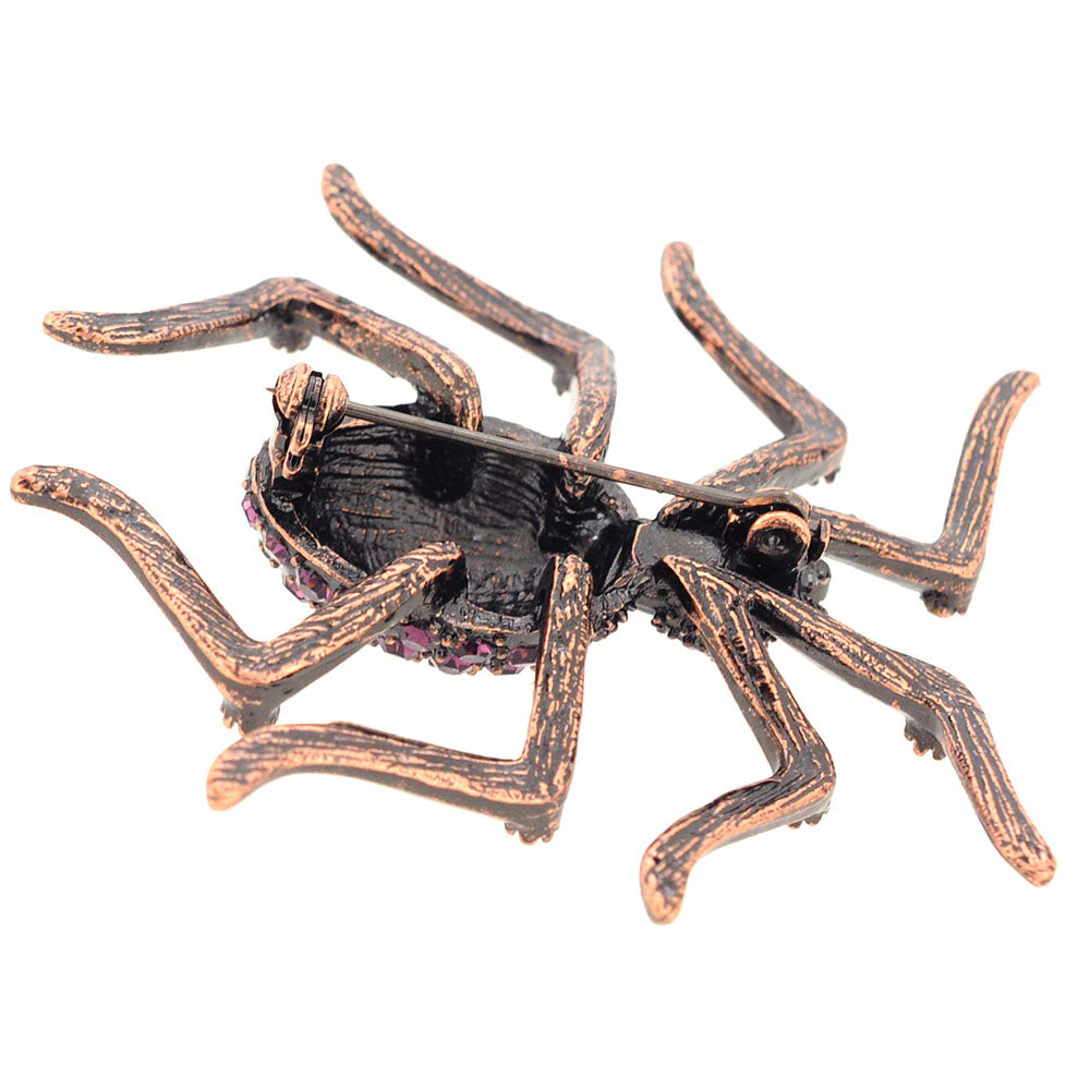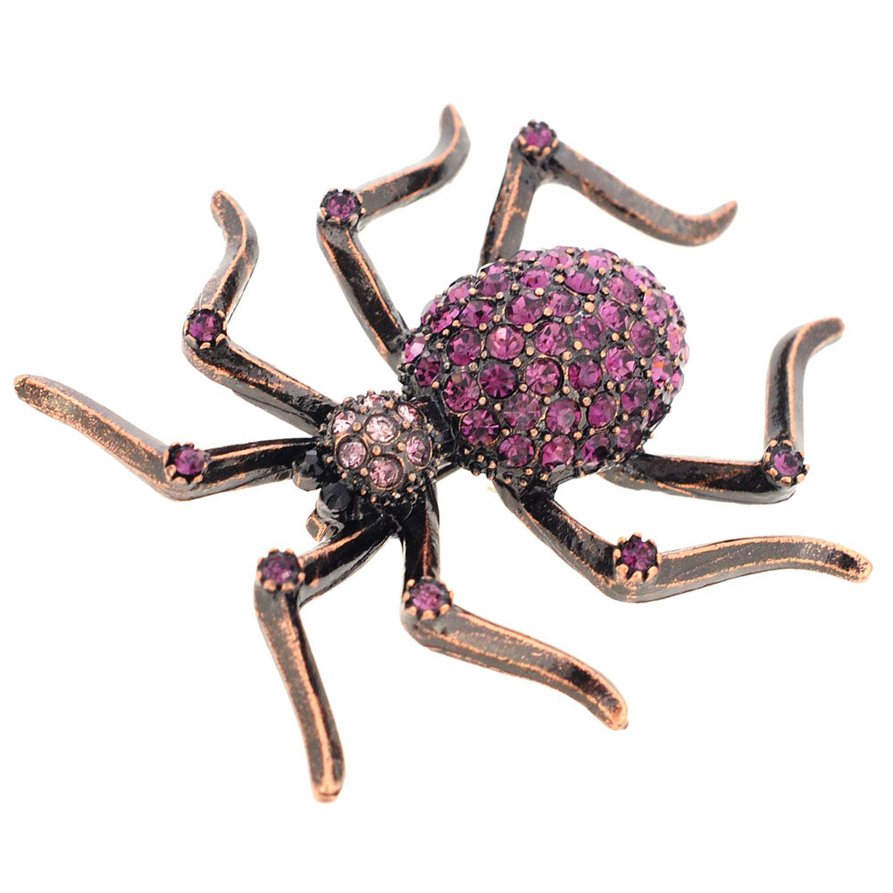 Who doesn't love spider brooches? This copper-toned pin will surely give those around you at your Halloween party the heebie-jeebies! This alloy-plated piece covered in amethyst Swarovski crystals wont disappoint your guest and most importantly You! This brooch includes two jet black crystals for the eyes and fastens securely with a metal clasp.