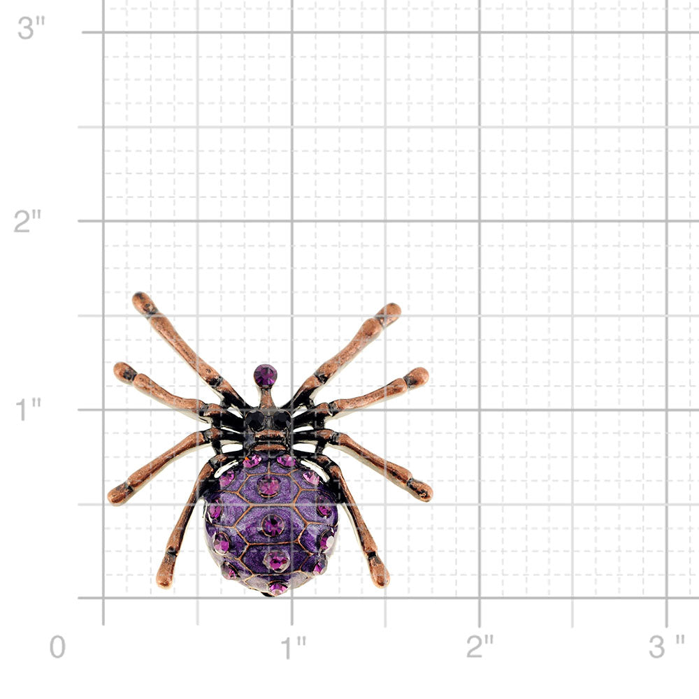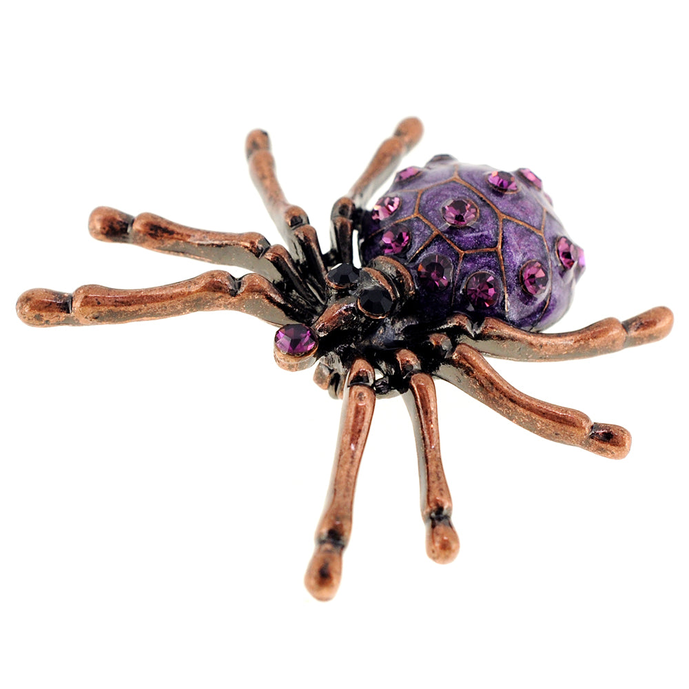 Looking for a scary spider brooch? This blue enamel copper tone brooch is the perfect addition to your Halloween outfit! This creepy crawley pin covered in amethyst Swarovski crystals can also be used as a pendant for a necklace. Fastens securely with a metal clasp. No chain included.