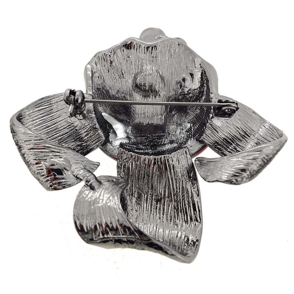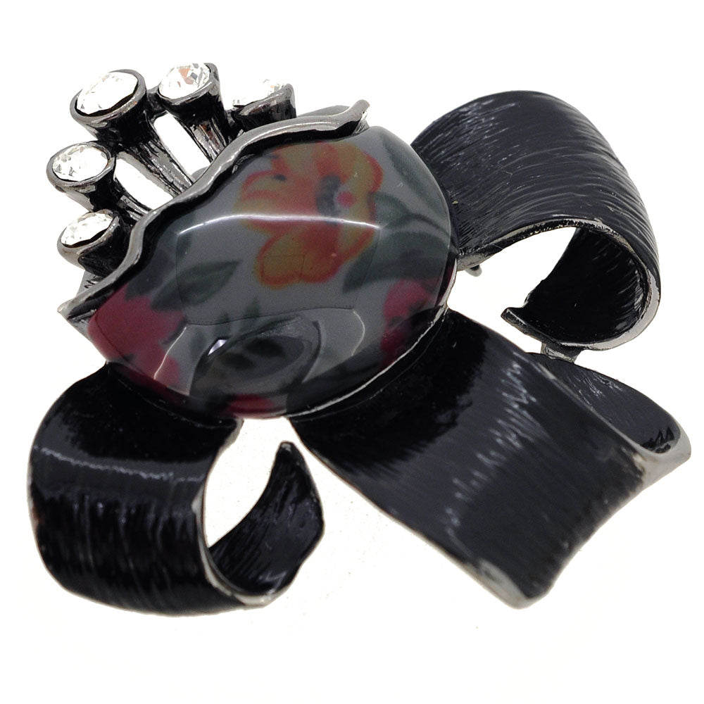 This abstract brooch has a different take on a flower. Features a hand painted enamel center and Austrian rhinestones on top of a black silver plated ribbon. Fastens securely with a metal clasp.
