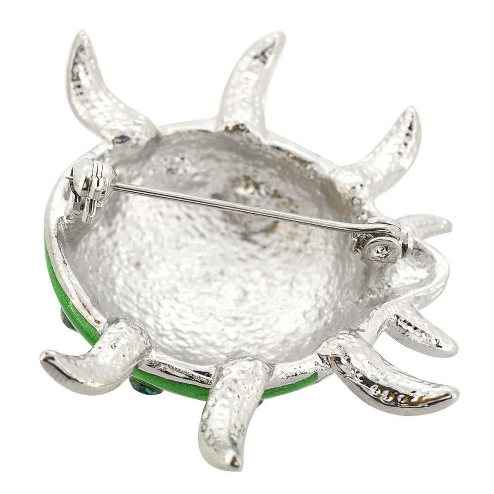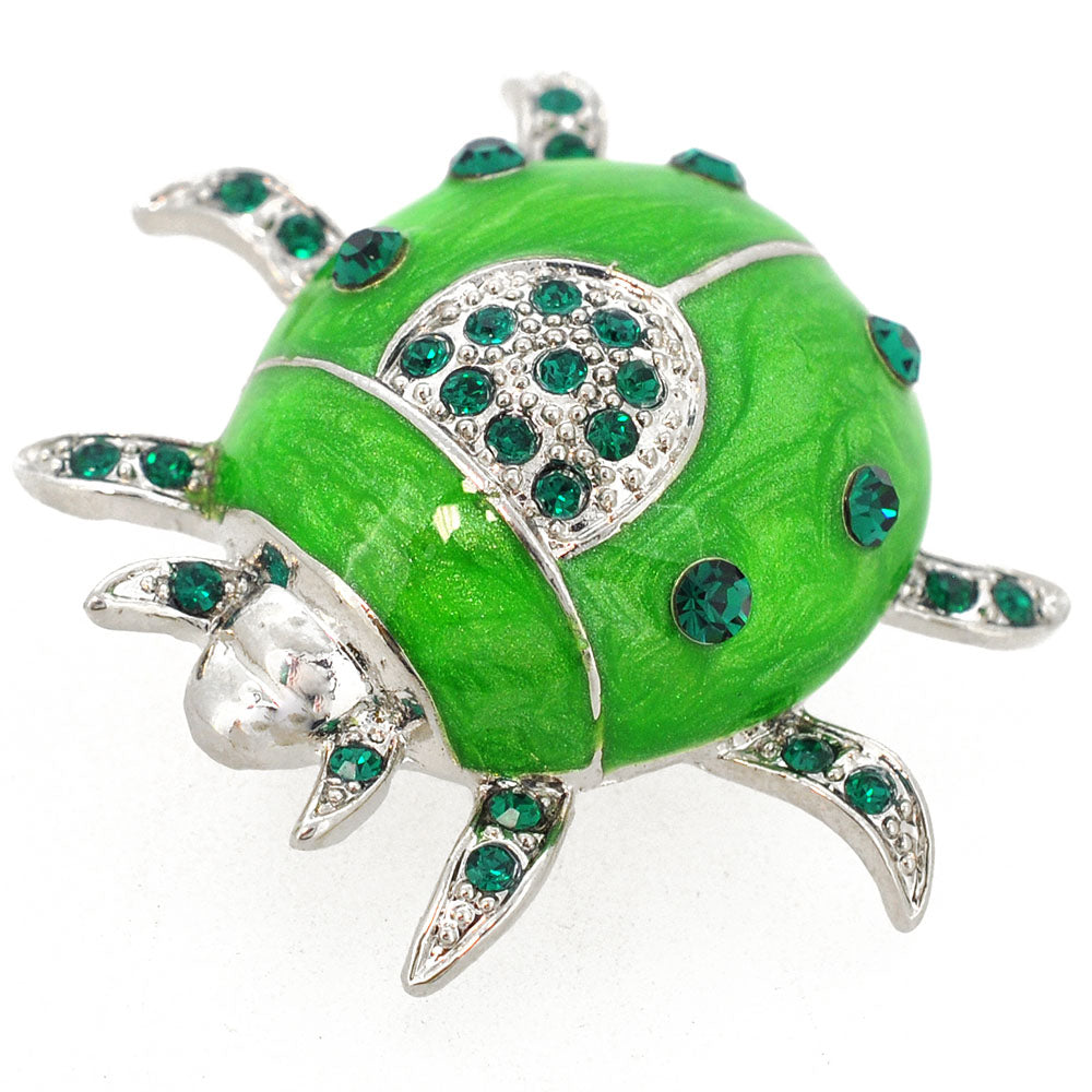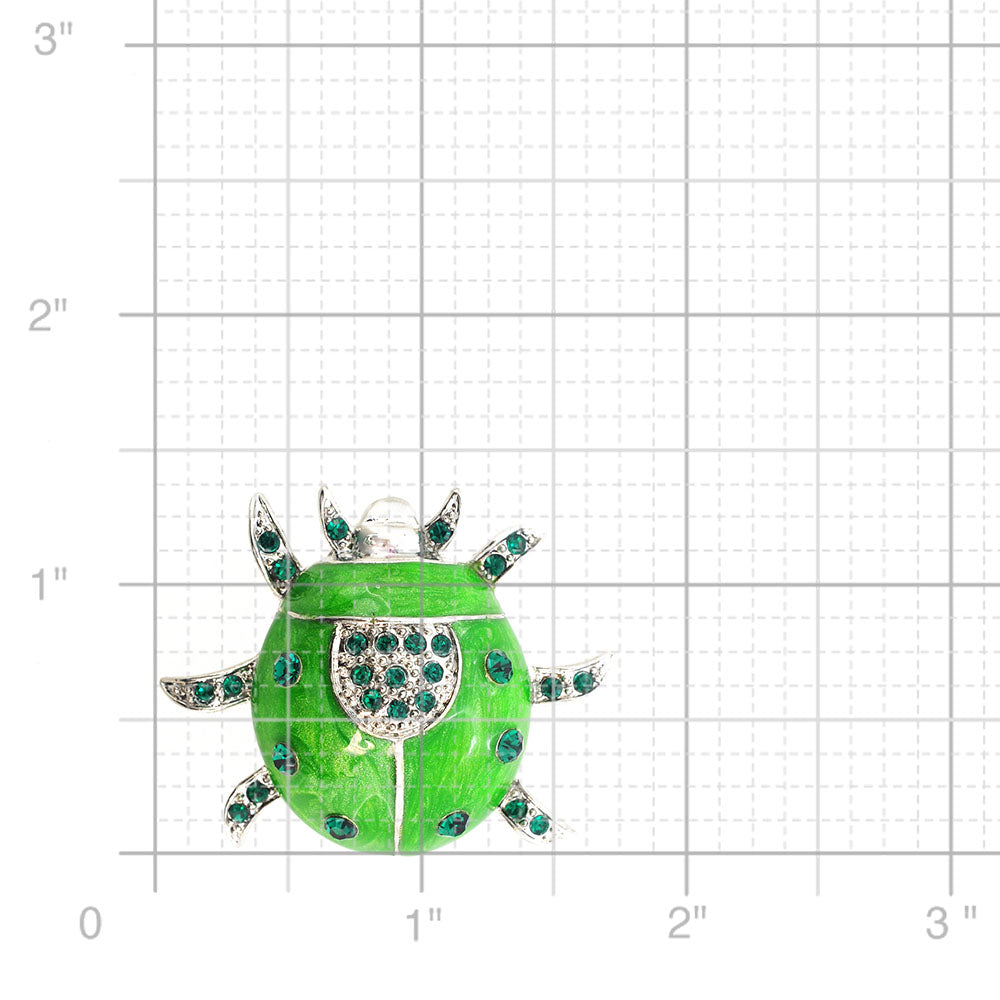 Are you a bug enthusiast? Then get your very own Green Beetle Bug Crystal Pin Brooch only from Fantasyard! This vibrant silver-toned beetle pin with emerald Swarovski crystals completely covering the body will surely make your day just a little bit brighter! This pin fastens securely with a metal clasp. See dimension chart below.