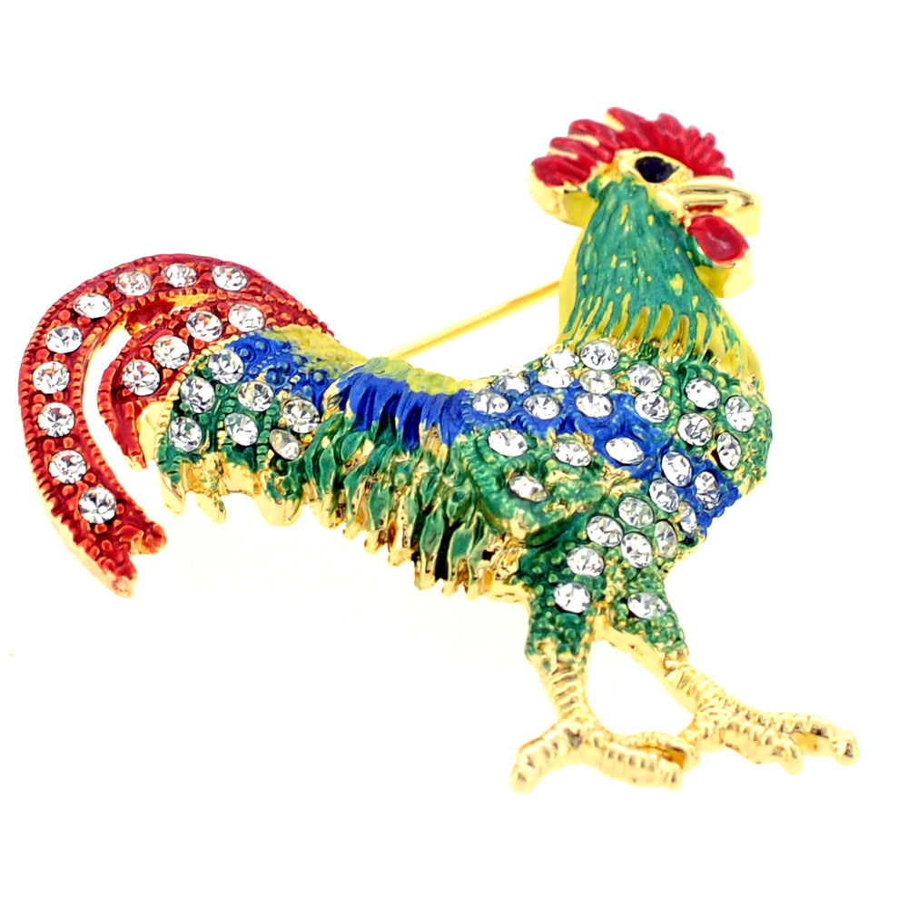 Green And Red Rooster Pin Swarovski Crystal Animal Pin Brooch