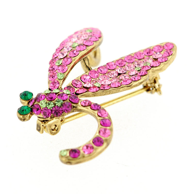 This gold-toned sparkly dragonfly with beautiful wings covered in fuchsia emerald and light and dark rose Swarovski crystals will surely make a Spring day so much better! This classic dragonfly brooch has two emerald crystals as the eyes and fastens securely with a metal clasp.