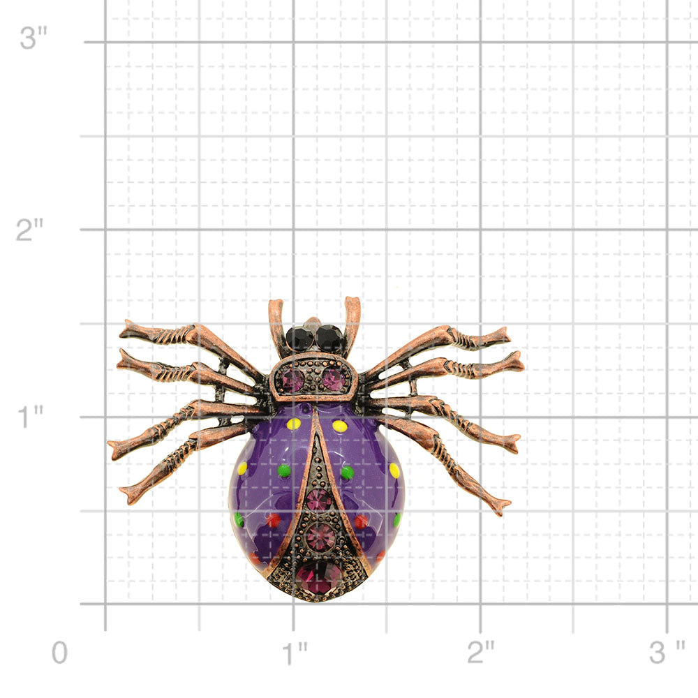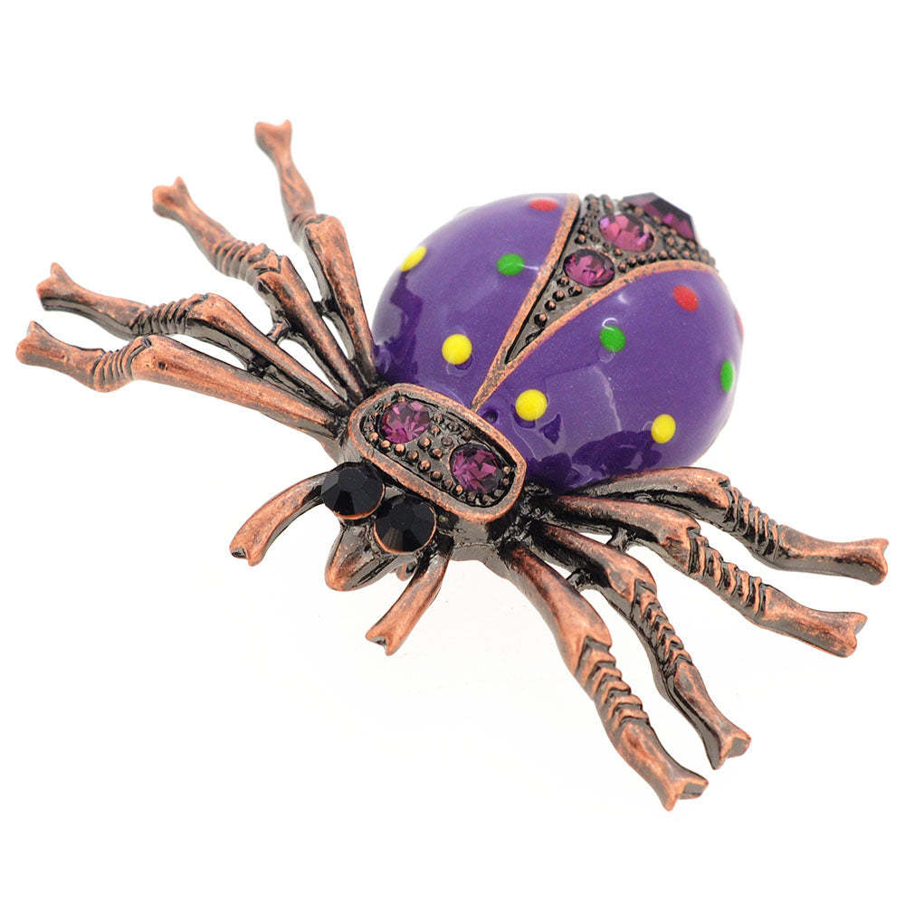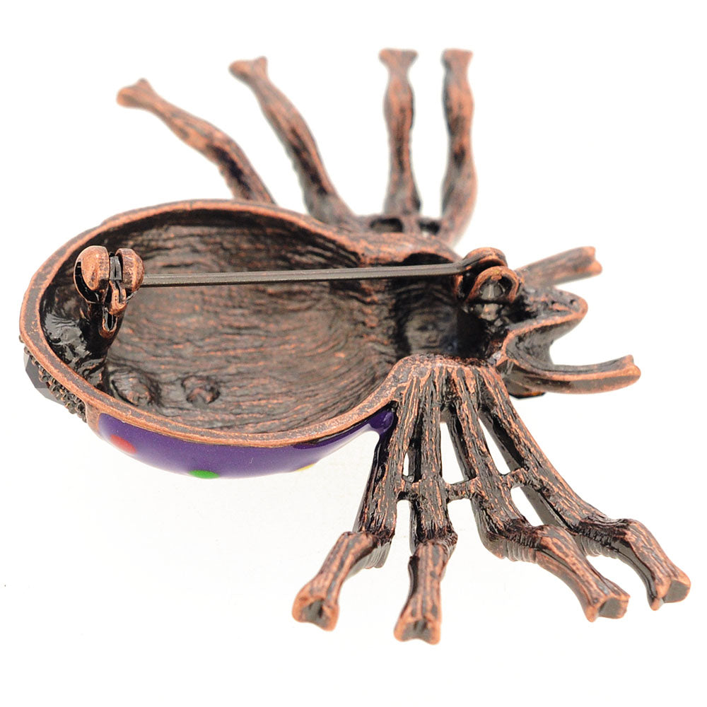 This funky brooch has pizzazz! Almost makes you forget that it is in fact a spider with its colorful exterior. It has a purple enamel shell decorated in multi-colored dots all set in an antique copper finish. It is adorned with amethyst swarovski crystals for extra shine. It fastens securely to any outfit with a metal clasp.