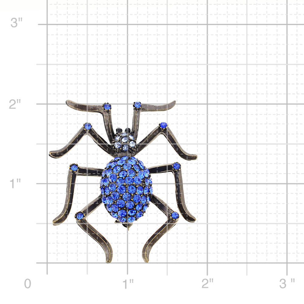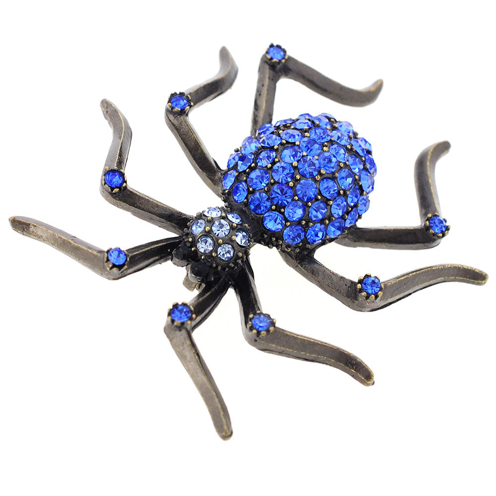 Who doesn't love spider brooches? This copper-toned pin will surely give those around you at your Halloween party the heebie-jeebies! This alloy-plated piece covered in light and dark sapphire Swarovski crystals wont disappoint your guest and most importantly You! This brooch includes two jet black crystals for the eyes and fastens securely with a metal clasp.